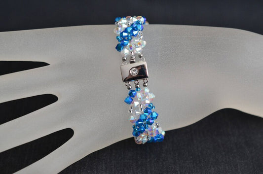 Bracelet cristal, manchette, cristal ab2x, capri blue ab2x, bleu et blanc
